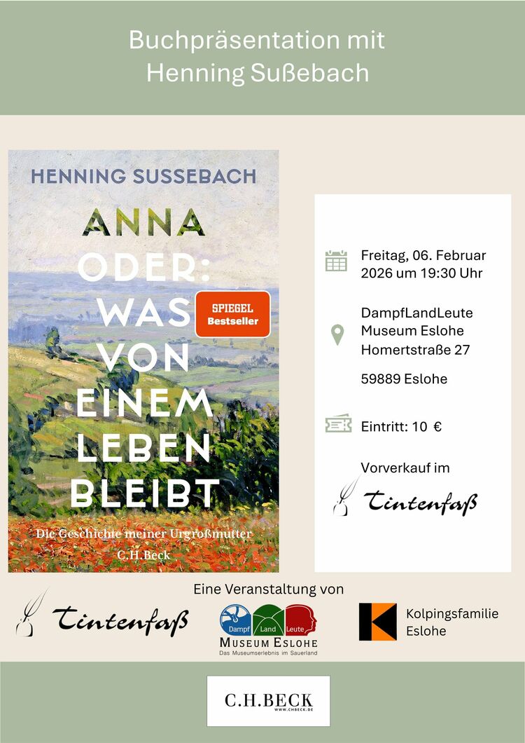 Die Lesung findet am 06.02.2026 um 19.30 Uhr im DampfLandLeute Museum Eslohe statt.